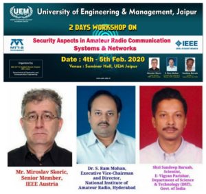 IEEE-MTTS Student Branch Chapter and IEEE UEMJ Student Branch in association, are organising a 2-Day IEEE Workshop on “Security Aspects in Amateur Radio Communication Systems and Networks” on 4th-5th February, 2020 at the University of Engineering & Management (UEM), Jaipur.