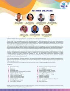 The Conference will take the form of Keynote Speeches, Symposia Individual Paper Presentations, and Poster Presentations. We invite you to join us for this exciting event and contribute to the future of English Language Education.