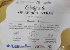 A team of first year students of University of Engineering and Management (UEM) Jaipur got 1st position and received the Certificate of Appreciation in Project Expo 2.0 organized by IEEE MTT-S SBC in association with IEEE AESS, IEEE APS, IEEE RAS, IEEE SB and Department of ECE, Manipal University, Jaipur on 21st