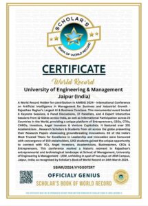 It is a BIG thing, and a matter of immense pride for us, that the University of Engineering & Management (UEM), JAIPUR has made a world record, officially recognized by the Scholar’s Book of World Records (Australia) for conducting an International Conference with 6 keynote sessions, 4 panel discussions, 37 panelists and 4 expert interactive sessions from 12 states across India and international participation from 23 countries in the world, providing a platform for Entrepreneurs, CEOs, CTOs, academicians, research scholars and students from across the globe to showcase their research. Also 50 top industrialists were awarded in the same platform, all these in a span of 2 days. It was a matter of privilege for me to receive the certificate of this recognition.