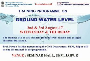 Central Ground Water Board, Ministry of Water Resources, River Development and Ganga Rejuvenation, Govt of India in association with University of Engineering & Management (UEM), Jaipur is organising a training programme on “Ground Water Level” on 1st and 2nd August, 2017 at the Seminar Hall, University of Engineering & Management (UEM), Jaipur.