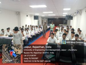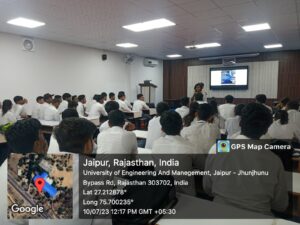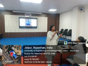 Codesta Coding Club of the University of Engineering & Management (UEM), JAIPUR, in association with IIC, and ACM Student Chapter UEMJ, has organized this workshop on “Intellectual Property Rights and IP Management for startup” for students of B.Tech CSE & AIML. Session was taken by Prof. (Dr.) G. Uma Devi. In this workshop, students learnt how IP rights such as patents, trademarks, and copyrights can provide legal protection for your own innovations, preventing others from copying or imitating them without permission. This helps startups maintain their market position and generate revenue from their ideas and many more. In the presence of Prof. Jyoti Khandelwal, Prof. Hriday Banerjee, Prof. Debajyoti Chatterjee & Mr. Sanjay Dash workshop was conducted successfully.