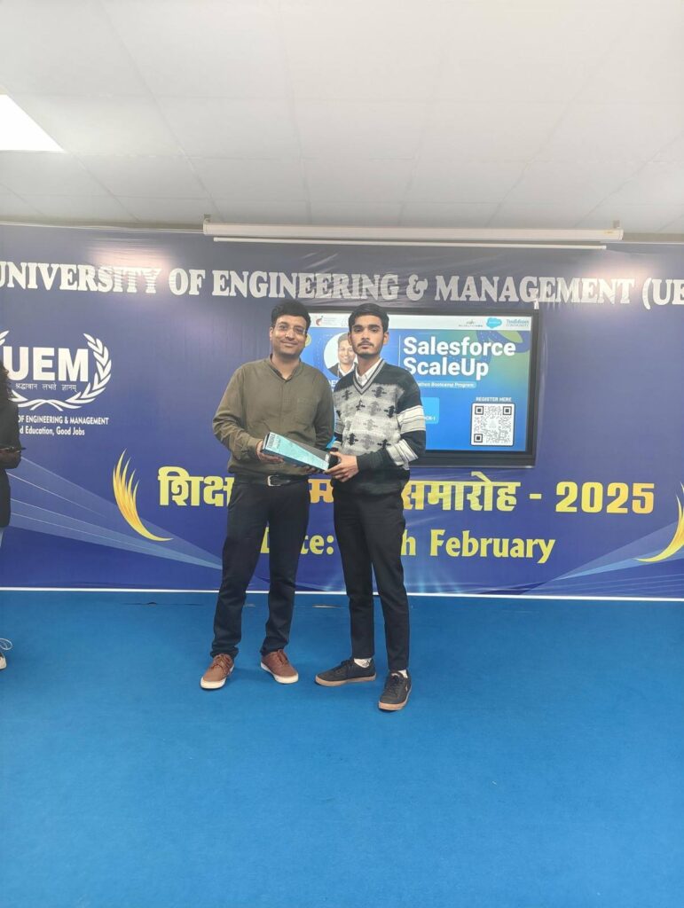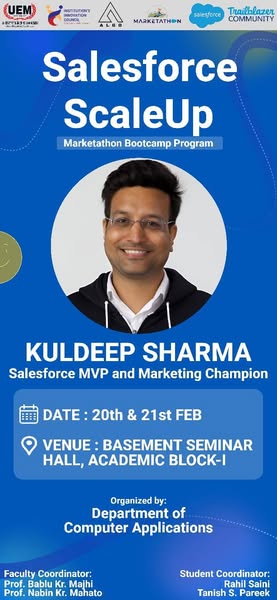 On 20th-21st February 2025, ALGO Club , Department of Computer Applications, University of Engineering & Management (UEM), Jaipur organized the ” Salesforce ScaleUp ” session, featuring Mr. Kuldeep Sharma , Salesforce MVP, Marketing Champion, and Vice President of Vanshiv Technologies .