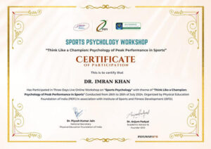 Dr. Imran Khan from the Department of Physiotherapy successfully completed a three-day workshop on sports psychology with the theme “Think Psychology of Peak Performance in Sports.” The workshop, conducted from July 26th to 28th, 2024, was organized by the Physical Education Foundation of India (PEFI) in association with the Institute of Sports and Fitness Development (ISFD).