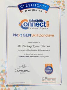 Prof. (Dr.) Pradeep Kumar Sharma, Registrar represented University of Engineering & Management (UEM), Jalpur and participated in a very engaging panel discussion on the topic The Shift from Degree to Skills – Conundrum of Merging Skills and Employability along with vice-chancellors and industry experts from other Institution and received the Certificate of Appreciation on behalf of UEM Jaipur for its efforts under EduSkills Centre of Excellence Program in the University.