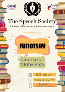 The event kicked off with an introduction to The Speech Society (TSS). Following this, we dived into a series of engaging games, starting with a Slido quiz and a general knowledge quiz. Next, TSS showcased a short video highlighting the past TSS event, Aarambh, featuring Kuldeep Singhania. We then introduced an interactive game called “Guess the Tagline,” where the audience guessed brands based on taglines and movies based on dialogues.Our final game is “Character Playing,” where students come on stage, draw a chit, and act out the given role.The event concluded with a prize distribution ceremony, an overview of the TSS training program, and a short video featuring the audience.
