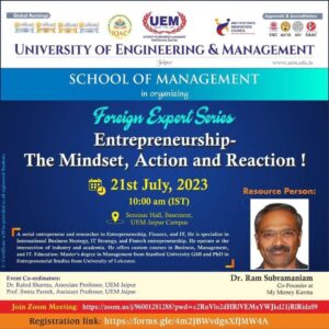 Glimpses of Foreign Expert Lecture Series organised by School of Management, UEM JAIPUR on the Topic Entrepreneurship – The Mindset, Action & Reaction by Mr. Ram Subramaniam, Co-Founder at My Money Karma, USA.