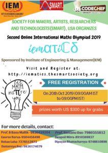 We are very proud to announce that the Society for Makers, Artists, Researchers and Technologists, (SMART) USA presents IEMATICS —–Second Online International Mathematics Olympiad sponsored by Institute of Engineering & Management (IEM) in association with Codechef.