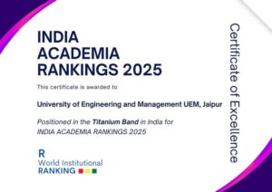 University of Engineering and Management (UEM) Jaipur has received Certificate if Excellence for being ranked in Titanium Band – Premier Institutions for Academic Excellence . https://www.wiranking.com/academia
