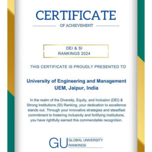It is a matter of immense pride this year, for all of us at UEM JAIPUR, that we are getting a series of prestigious international recognitions. Few days back, we were enlisted and ranked in the most prestigious Times Higher Education (THE) Global ranking, London amongst top universities across the world. Now, we have also been ranked in GU (Global University) rankings for Diversity, Equity, and Inclusion (DEI) & Strong Institutions (SI), 2024 – London UK, in a position 1000 to 1200 rank band amongst 40,000+ universities across the world (the figure as estimated in 2014).