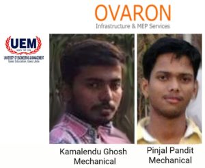 Heartiest CONGRATULATIONS to Kamalendu Ghosh and Pinjal Pandit, 2018 Mechanical Engineering passout students of the University of Engineering & Management (UEM), Jaipur for having got job offer from Ovaron Infrastructure & MEP Services.