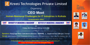 Kreeti Technologies Private Limited in association with University of Engineering & Management (UEM) and Institute of Engineering & Management (IEM) is organising a CEO Meet named “Human Resource Challenges for IT Industries in Kolkata” on 8th February 2019 at 10:15 AM at AltAir Boutique Hotel, EcoCentre Ambuja Neotia 4, EM Block Sector V, Salt Lake City, Kolkata, WB – 91.