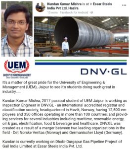 Kundan Kumar Mishra, 2017 passout student of UEM Jaipur is working as Inspection Engineer in DNV.GL – an international accredited registrar and classification society, headquartered in Høvik, Norway, having 12,500 employees and 350 offices operating in more than 100 countries, and providing services for several industries including maritime, renewable energy, oil & gas, electrification, food & beverage and healthcare. DNV.GL was created as a result of a merger between two leading organizations in the field – Det Norske Veritas (Norway) and Germanischer Lloyd (Germany).