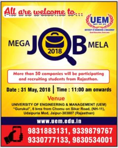 All are welcome to Mega Job Mela – 2018, which will create the biggest recruitment platform for all Freshers at the University of Engineering & Management (UEM), Jaipur on 31st May, 2018.
