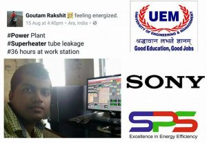 Mr. Goutam Rakshit, 2016 batch passout student of the University of Engineering & Management (UEM), Jaipur, who was previously working for Sony India is now working for Solven Power Systems and his post shows him, managing a fault of a Superheater Tube Leakage, working 36 hours at work station, at a stretch, at a Power Plant – Sri Vishnu Vishal Paper Mill Pvt. Ltd. for his company.