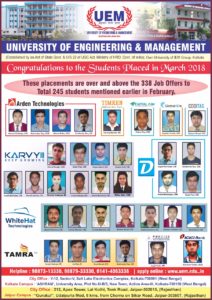 These are the set of students of the University of Engineering & Management (UEM), Jaipur who again got further placement in March, 2018 after the 338 job offers to eligible 245 students till February, 2018.