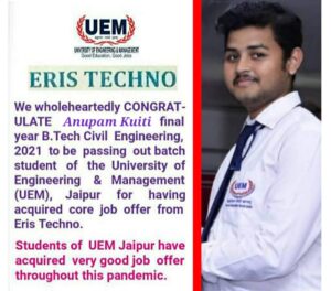 We wholeheartedly CONGRATULATE Anupam Kuiti, final year B.Tech Civil Engineering, 2021 to be passing out batch student of the University of Engineering & Management (UEM), Jaipur for having acquired core job offer from Eris Techno.