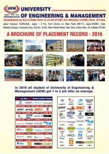 A plethora of companies visited UEM campus in 2016 and have recruited the UEM students, resulting in an average campus placement of 1 to 2 companies per student for the UEM students.