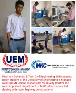 Prashant Devanda, B.Tech Civil Engineering, 2018 passout student of the University of Engineering & Management (UEM), Jaipur passed out of the University one month back and is already working in Quality Control Lab at MKC Infrastructure Ltd, designated as Quality Control Engineer. Quality Control is one of the most important parameter and the most important department of MKC Infrastructure Limited. Prashant is responsible for the overall quality and grade of civil engineering works in his site, including major highway constructions.