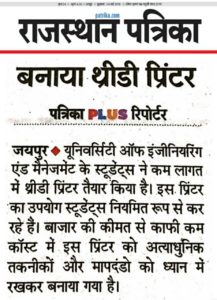 A news release in Rajasthan Patrika, the leading newspaper of Rajasthan on 4th May, 2018, about the industrial 3-D printer designed and manufactured by the students of the University of Engineering & Management (UEM), Jaipur in their UEM Jaipur laboratory.