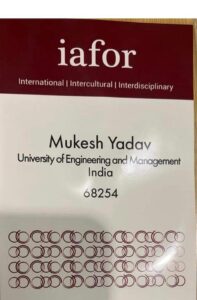 Prof. (Dr.) Mukesh Yadav, University of Engineering & Management (UEM), JAIPUR presented his paper in Asian Conference on Cultural Studies-2023, organised at Tokyo, Japan by International Academic Forum in association with Osaka University, Japan held from 19-22 May, 2023. He is among the few presenters invited from India. He represented India as a delegate from University of Engineering & Management (UEM), JAIPUR. His paper is also accepted for publication in Scopus Indexed Journal.