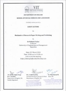 Professor (Dr.) Mukesh Yadav, HOD, Department of English delivered an invited online lecture titled “Mechanics of Research Paper Writing and Publishing” to the faculty and students of Vellore Institute of Technology, Chennai. The lecture was well-received, with over 125 participants in attendance. It provided valuable insights into the intricacies of academic writing and the process of publishing research papers.