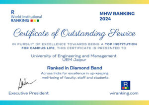 University of Engineering and Management UEM Jaipur is ranked in the DIAMOND BAND across India under Mental Health and Wellbeing – MHW Rankings 2024 in Pursuit of Excellence Towards being a Top Institute for Campus Life for excellence in up-keeping well-being of faculty, staff and students.