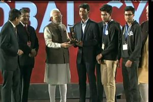 Sayak Dhar (CSE), Saswata Das(CSE) and Debanjit Sarkar(CSE), students of University of Engineering & Management (UEM), Kolkata, students of University of Engineering & Management (UEM), Kolkata receiving award from Honourable Prime Minister Shri Narendra Modi, today in New Delhi.