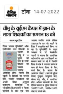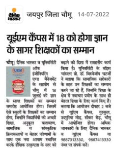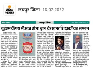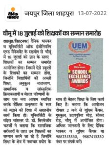 Today, 18th July, 2022, School Excellence Awards will be given away to the Best Teachers of the schools and their Principals, by the University of Engineering & Management (UEM), JAIPUR in association with Dainik Bhaskar.