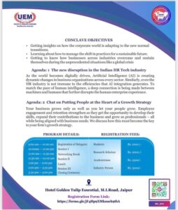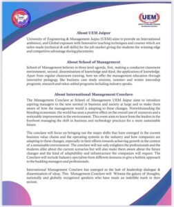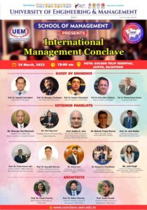 School of Management, University of Engineering & Management (UEM), Jaipur have taken the initiative to organize an “International Management Conclave” on March 24th, 2023 at Hotel Golden Tulip Essential, MI Road, Jaipur.