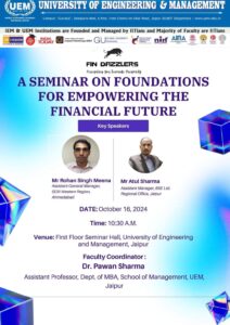 It is very important for us to learn how to manage the finance, be it in our official responsibilities or at our home. We are very happy to see that our students of the School of Management under the guidance of their teachers, have organized these learning sessions on “Empowering the Financial Future”. Mr. Rohan Singh Meena, Assistant General Manager, SEBI Western Region (Securities and Exchanged Board of India, Govt. of India) and Mr. Atul Sharma, Assistant Manager, BSE Ltd. (Bombay Stock Exchange) are very important people in this domain. We hope the sessions will be very important for both their personal growths and the growth of the organizations, they will be working in near future.