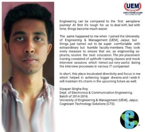 The same happened to me when I joined the University of Engineering & Management (UEM), Jaipur, but things just turned out to be super comfortable with extraordinary but humble faculty members. They took every measure to ensure that we, as engineering aspirants, receive the best education. The pre-placement training consisted of aptitude training classes and mock interview sessions, which turned out very useful during the interview processes in various IT companies!