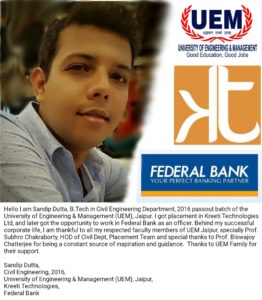 Hello I am Sandip Dutta, B.Tech in Civil Engineering Department, 2016 passout batch of the University of Engineering & Management (UEM), Jaipur. I got placement in Kreeti Technologies Ltd, and later got the opportunity to work in Federal Bank as an officer. Behind my successful corporate life, I am thankful to all my respected faculty members of UEM Jaipur, specially Prof. Subhro Chakraborty, HOD of Civil Dept, Placement Team and special thanks to Prof. Biswajoy Chatterjee for being a constant source of inspiration and guidance. Thanks to UEM Family for their support.