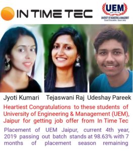 Heartiest CONGRATULATIONS to Jyoti Kumari, Tejaswani Raj and Udeshay Pareek – students of University of Engineering & Management (UEM), Jaipur for having got job offer from IN TIME TEC.