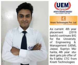 4th YEAR PLACEMENT 2019 BATCH UEM JAIPUR UPDATION – Reaches starting CTC offer of Rs 5 lakhs per annum till now:-