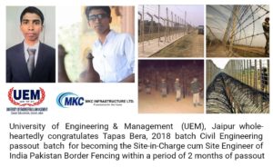 We wholeheartedly congratulate Tapas Bera, 2018 Civil Engineering passout student of the University of Engineering & Management (UEM), Jaipur for being promoted through his company MKC Infrastructure Ltd, as the Site-in-Charge cum Site Engineer of India Pakistan Border Fencing at Rann of Kutch, within a period of two weeks of his passing out of UEM Jaipur.
