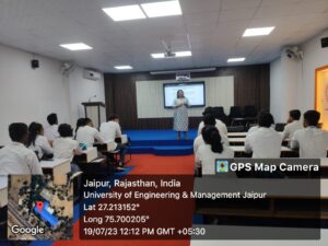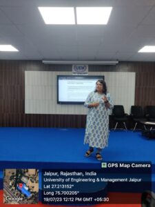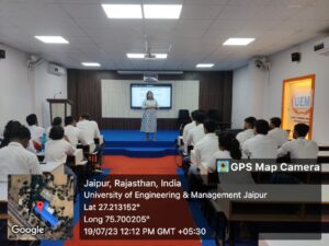 The Codesta Coding Club of the University of Engineering & Management (UEM), JAIPUR, in association with the Institution’s Innovation Council (IIC) and AMC Student Chapter UEMJ, organized a session on “How to Plan for Start-up and Legal & Ethical Steps” on 19th July 2023 at 12.00 pm in the Basement Seminar Hall. The session was conducted Professor Jyoti Khandelwal, UEM JAIPUR, highlighting the key parameters of a startup and emphasizing the importance of careful planning and strategic approaches for success and sustainability. The discussion covered various legal and ethical aspects, including selecting the right business structure, acquiring necessary licenses and permits, and implementing ethical practices. The event, witnessed active participation from enthusiastic attendees and was made possible by the dedicated efforts of the participants and event coordinators.