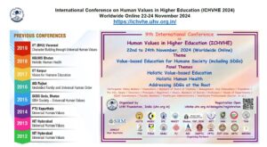 The International Conference on Human Values in Higher Education (ICHVHE) is an annual conference organized by The UHV Foundation Delhi for education policymakers, chancellors, vice chancellors/directors, other key decision-makers in education, and persons committed to value-based education. The conference is aimed at developing a shared vision of holistic, value-based education or education for the well-being of all. While the initial scope is SAARC nations, the effort is ultimately for human education globally; and through human education, the emergence of a human society, in which the well-being of all is realised generation after generation. The theme of the 2024 conference is Value-based Education for Humane Society (including SDGs). This 9th ICHVHE is being organized by 22 collaborating institutions from India and Bhutan including AICTE, SRM and other prominent institutions.