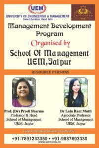 The sessions will be conducted by Prof. Dr. Preeti Sharma and Prof. Dr. Lata Rani Mutti, UEM Jaipur.