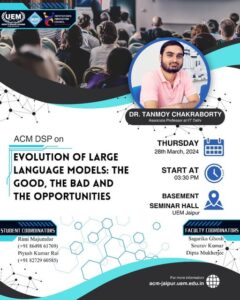 UEM Jaipur ACM Student Chapter is thrilled to present a Distinguished Speaker Program on “Evolution of Large Language Models: The Good, The Bad and The Opportunities” featuring the esteemed Prof. (Dr.) Tanmoy Chakraborty from IIT Delhi.