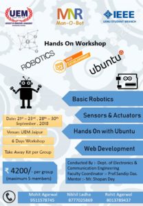 University of Engineering & Management (UEM), Jaipur in association with IEEE UEMJ Student Chapter is organising “Man-o-Bot” – a Hands-on Workshop on Basic Robotics, Sensors & Actuators, Hands on with Ubuntu and Web Development.