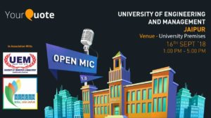 The University of Engineering & Management (UEM), Jaipur in association with “Your Quote” organization is organising Open Mic under UEM Jaipur chapter, on 16th September, 2018, starting from 1 pm.