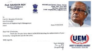 The University of Engineering & Management (UEM), Jaipur is proud to have received this letter of appreciation from Prof. Saugata Roy, Member of Parliament, Lok Sabha and Former Minister of State for Urban Development.