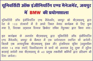 As part of the program, a laboratory will be set up at UEM Jaipur with a state-of-the-art BMW engine and transmission unit (worth Rs 14 lakhs), to be provided free of cost to our University for learning purposes. These will be  BMW’s proprietary TwinPower Turbo In-Line 4-Cylinder Diesel Engine and Eight-Speed Steptronic Automatic Transmission.