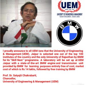 We are proud to announce that the University of Engineering & Management (UEM), Jaipur has been selected 1 out of the 100 institutes of the country, and the only University of Rajasthan by BMW for its “Skill Next” programme, launched by cricket legend Sachin Tendulkar.