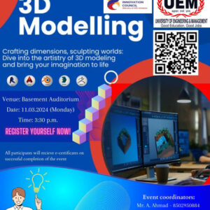 University of Engineering and Management, Jaipur is organising a hands-on workshop on 3D Modeling. The craze for 3D modeling skill is in high demand in the present time. Hence, learning hands-on, to develop 3D models for AR/VR applications, or for industrial equipments like HVAC design, etc. will be a great skill in the present as well as the future.