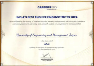 University of Engineering and Management (UEM) Jaipur has been rated as AAA+ by Career360 – after evaluating the quality of students, faculty, learning engagement, infrastructure, graduate outcomes, placements, diversity and research output.