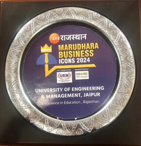 University of Engineering and Management UEM Jaipur has received the award for EXCELLENCE IN EDUCATION IN RAJASTHAN during the program MARUDHARA BUSINESS ICON 2024 by ZEE Rajasthan on Thursday 29th February 2024 in Lalgarh Palace in Bikaner Rajasthan.