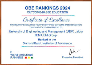 University of Engineering and Management UEM Jaipur is ranked in the DIAMOND BAND as INSTITUTION OF PROMINENCE under OBE RANKINGS 2024 – OUTCOME-BASED EDUCATION in Pursuit of Excellence Towards Offering Outcome-Based Education.