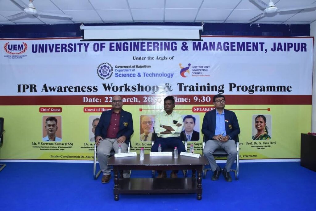 University of Engineering and Management (UEM), Jaipur successfully conducted a one-day IPR Awareness Workshop and Training Program on March 22, 2025, to spread awareness about Intellectual Property Rights (IPR) among students, faculty, and professionals.